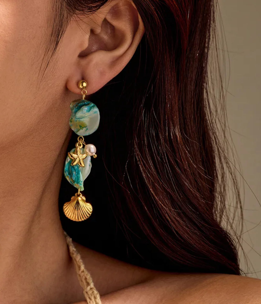Los aretes Brisa Turquesa celebran la belleza del océano. Con piedras en tonos aguamarina, delicadas perlas y detalles dorados como estrellas de mar y conchas, estos aretes irradian frescura, elegancia y un toque tropical. Hechos de acero inoxidable con baño de oro, son hipoalergénicos e impermeables, perfectos para realzar tu estilo veraniego con el encanto caribeño.