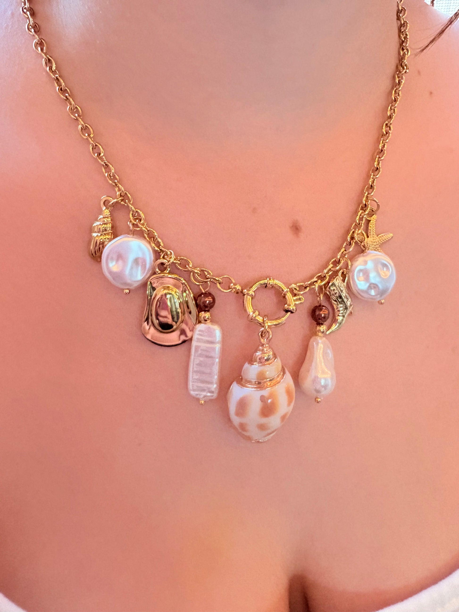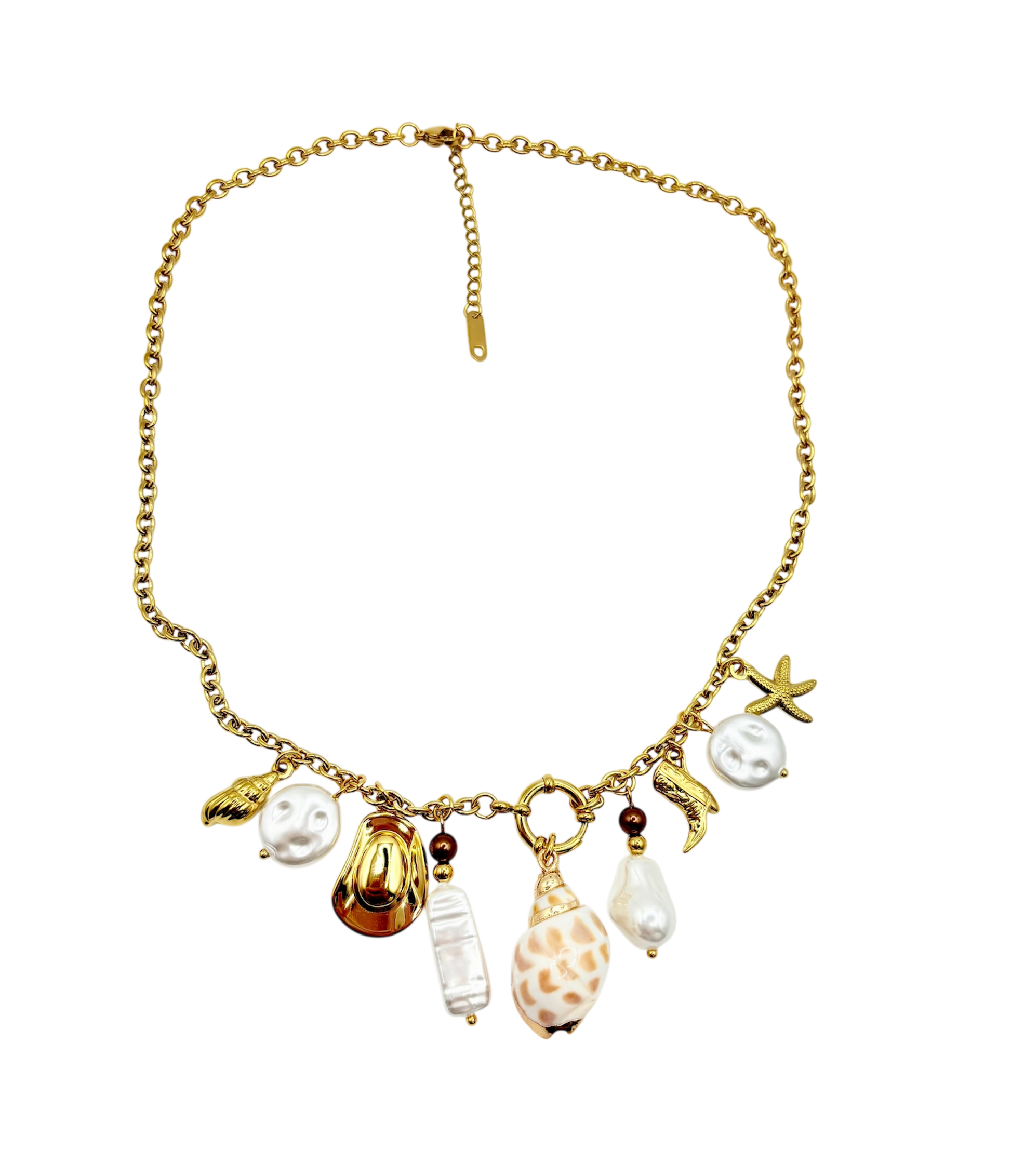Inspired by the ocean's hidden treasures, Whispers of the Sea is a golden necklace blending the delicacy of pearls, the shimmer of coral, and the mystery of sea shells. Each charm tells a story from the Caribbean, creating a piece full of movement, texture, and tropical soul. Perfect for lovers of summer, the beach, and unique details.