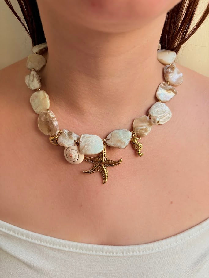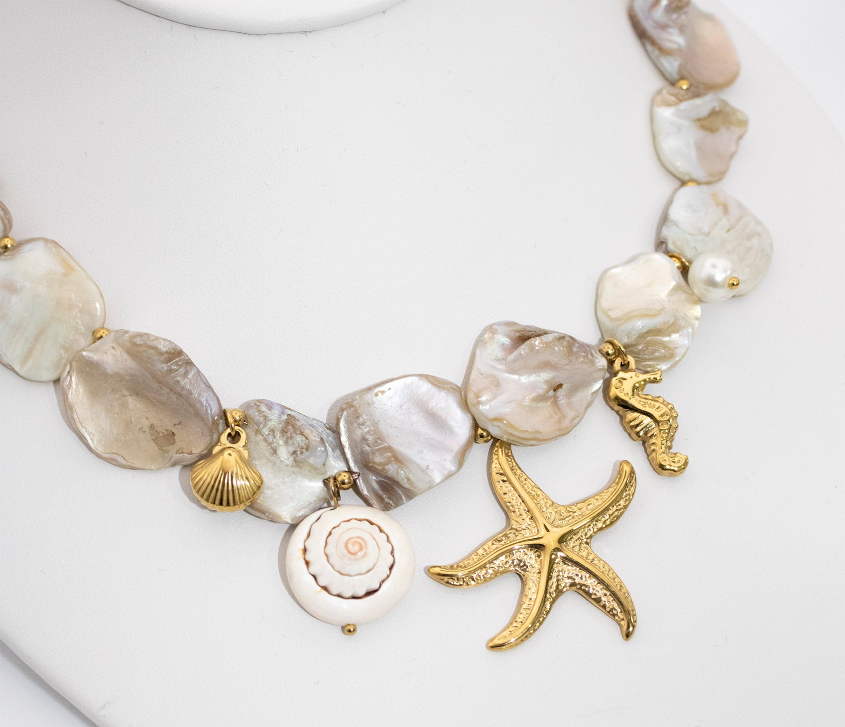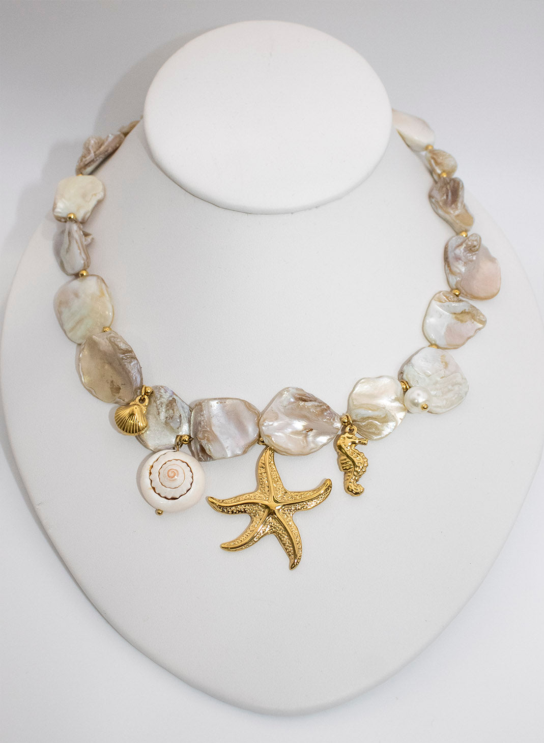 Feel the ocean breeze with Ola Dorada — a unique 316L stainless steel piece featuring seashell beads, a golden starfish, and a seahorse. Perfect to express your free and elegant summer soul.