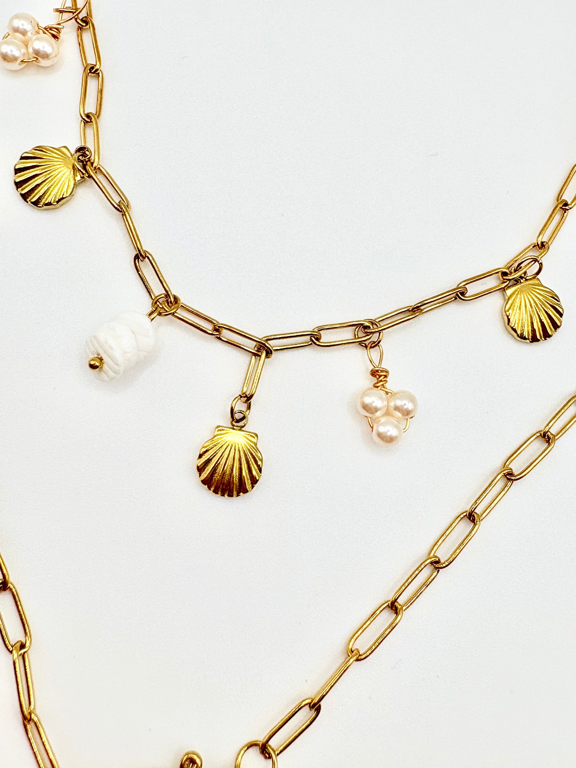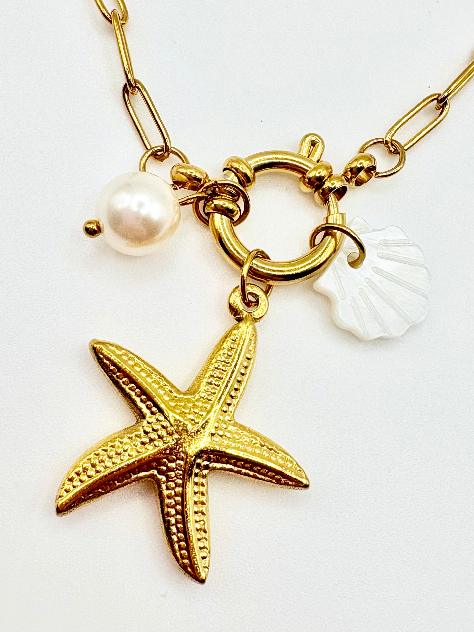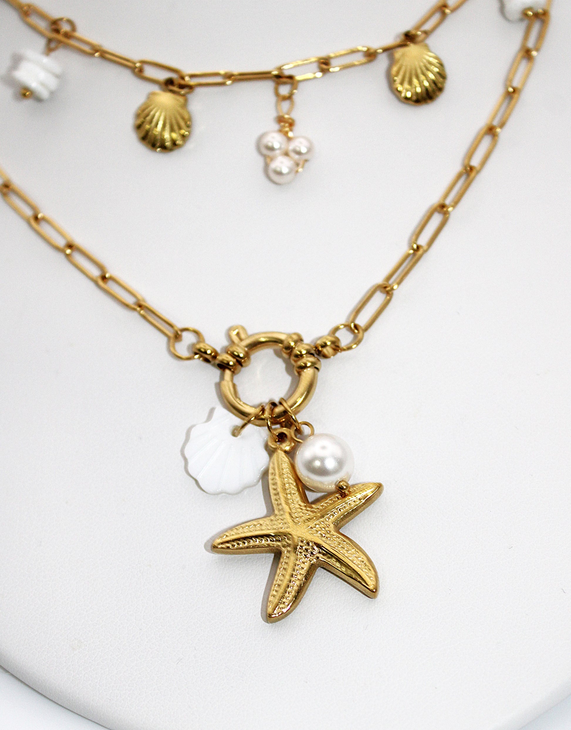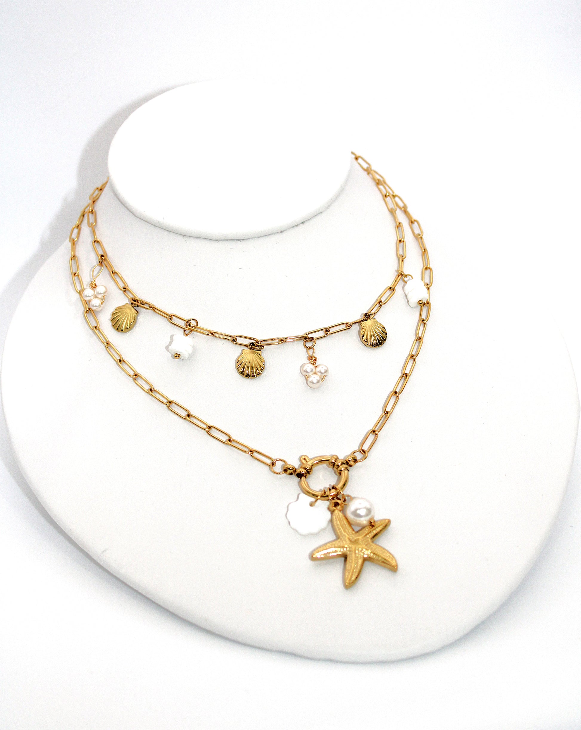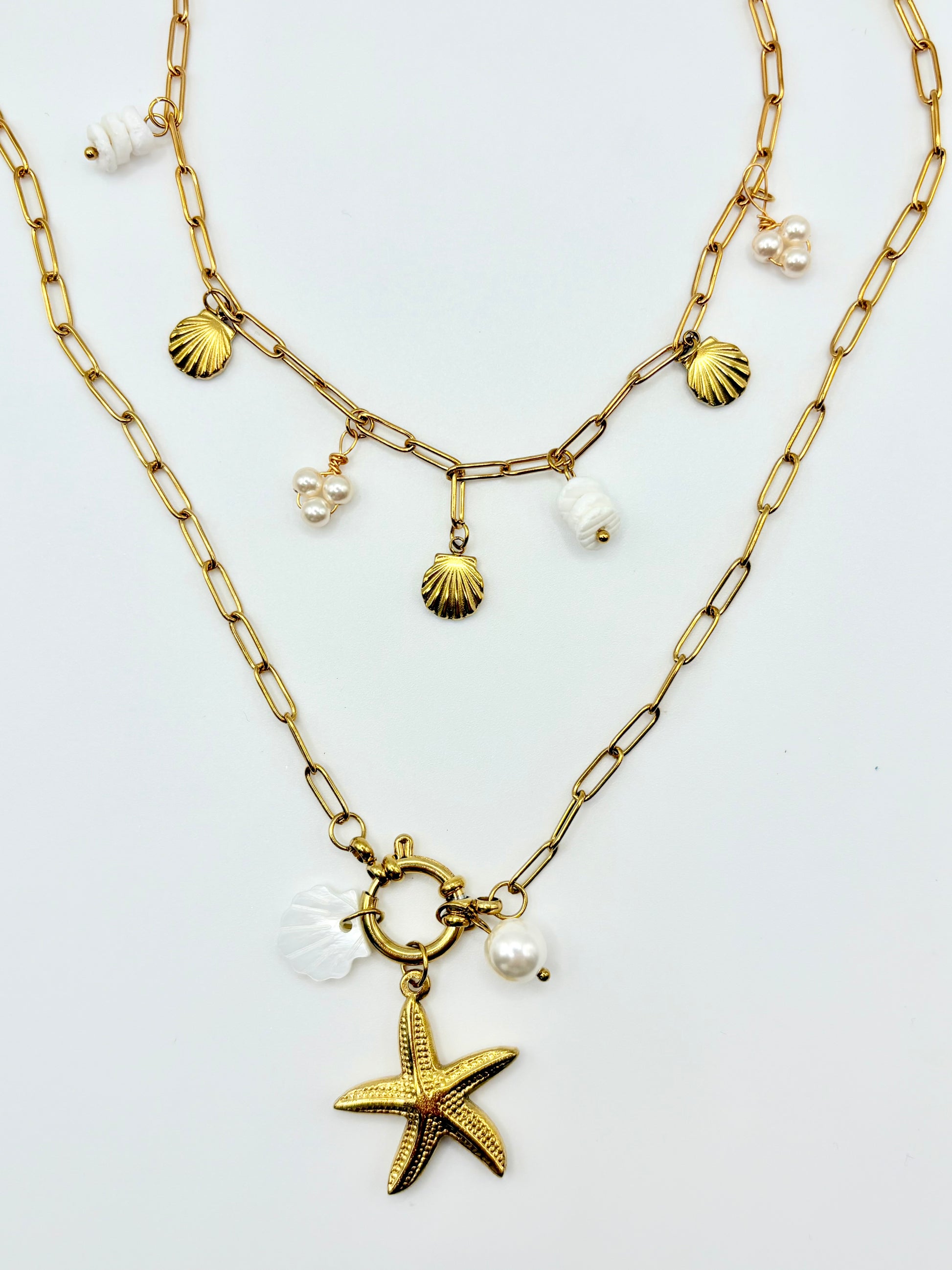 El collar Miami captura el glamour relajado de la vibrante ciudad costera. Con dos cadenas de oro, conchas, perlas y un dije central de estrella de mar, esta pieza de acero inoxidable bañada en oro es perfecta para los días soleados de playa o las cálidas noches de Miami. Resistente al agua, hipoalergénico y con un toque tropical.