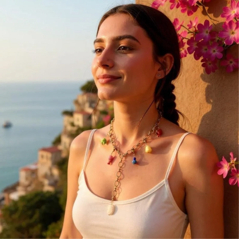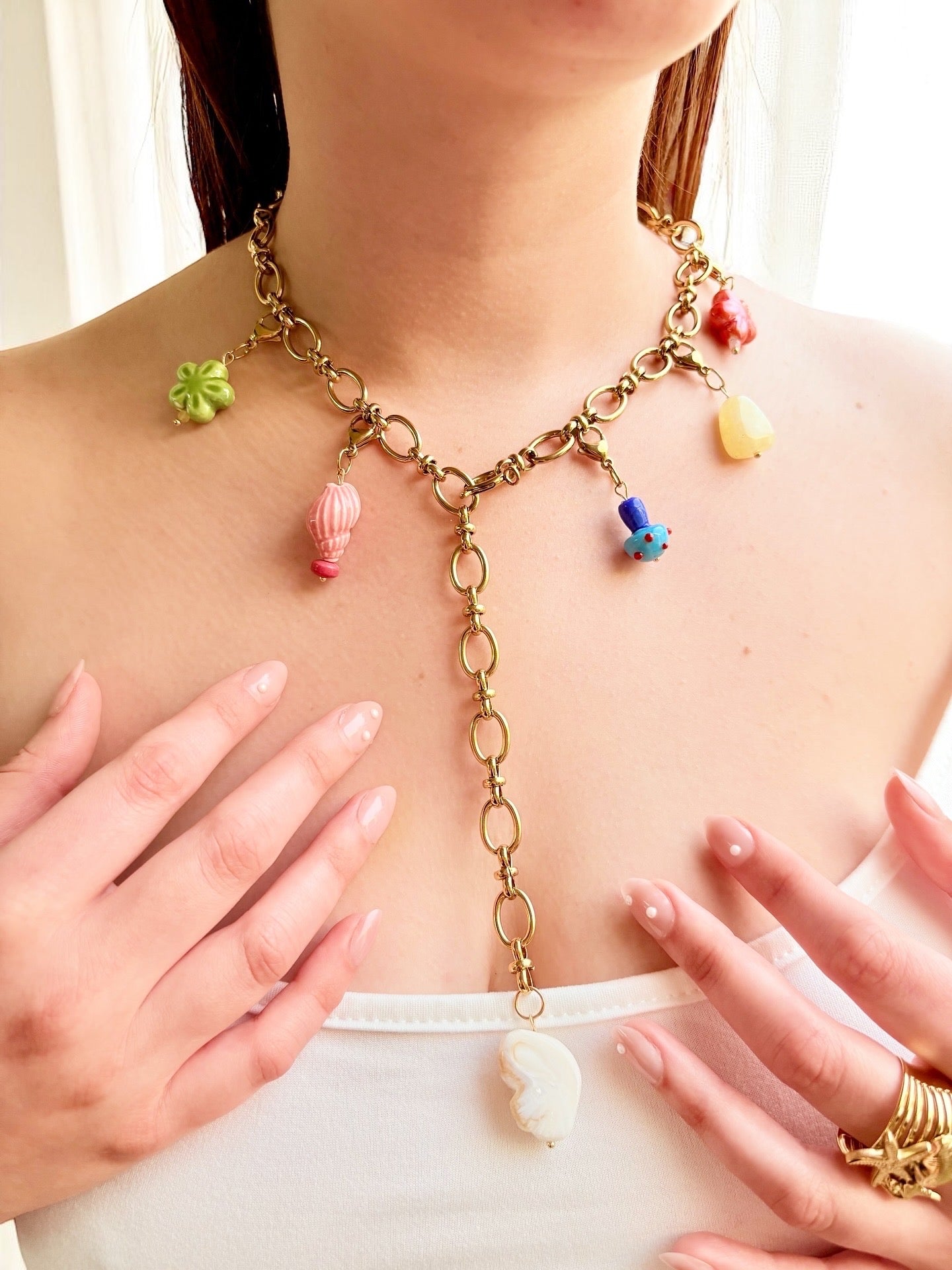 Let yourself be carried away by the magic of the sea with Ocean Whimsy, a gold necklace adorned with handmade charms inspired by the ocean. Colored glass beads and a natural shell bring to life the free and tropical spirit of the Caribbean. Part of the Caribbean Charm collection, it is the perfect piece to shine with style all summer long.